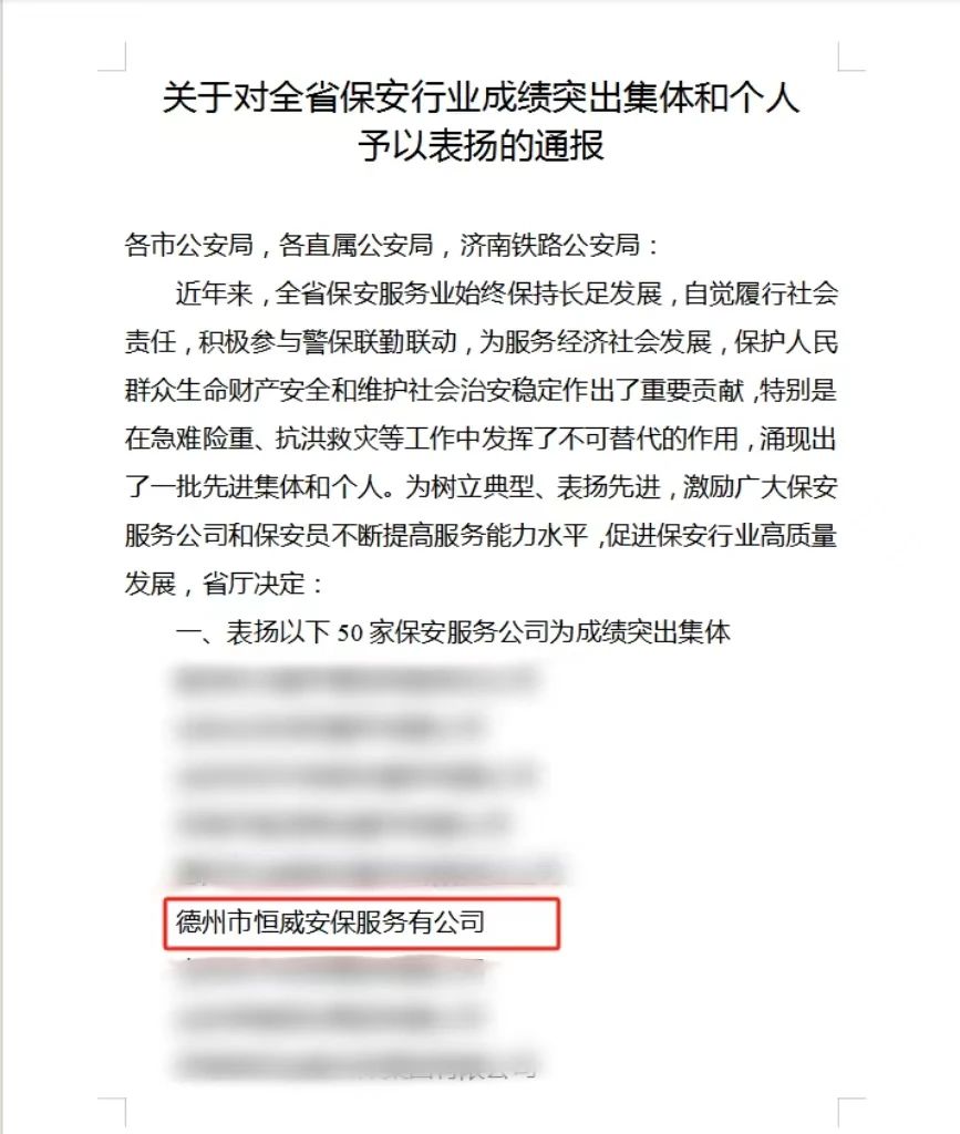 近日,山東省公安廳印發《關于對全省保安行業成績突出集體和個人予以表揚的通報》,德州市恒威安保服務有限公司榮獲2023年度“全省保安行業成績突出集體”榮譽稱號;公司員工尹紀昌、王可心榮獲“成績突出個人”。