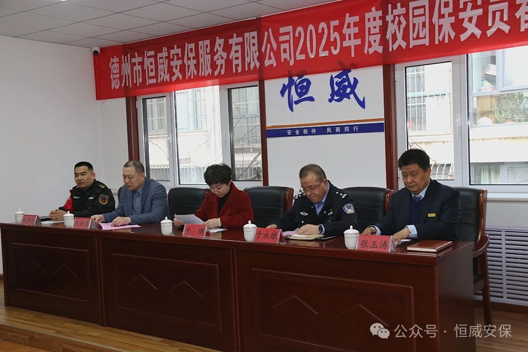為進一步提升校園安全防范能力,筑牢師生安全屏障,2月28日下午,德州市恒威安保服務有限公司2025年度校園保安員春季專題培訓開班儀式隆重舉行。區教體局副局長于瑛、區公安分局治安大隊大隊長于永墩、德州市恒威安保服務有限公司總經理王新衛等領導出席儀式,來自全區各中小學、幼兒園的60余名校園保安員代表參加活動。會議由公司副總經理張玉濤主持。